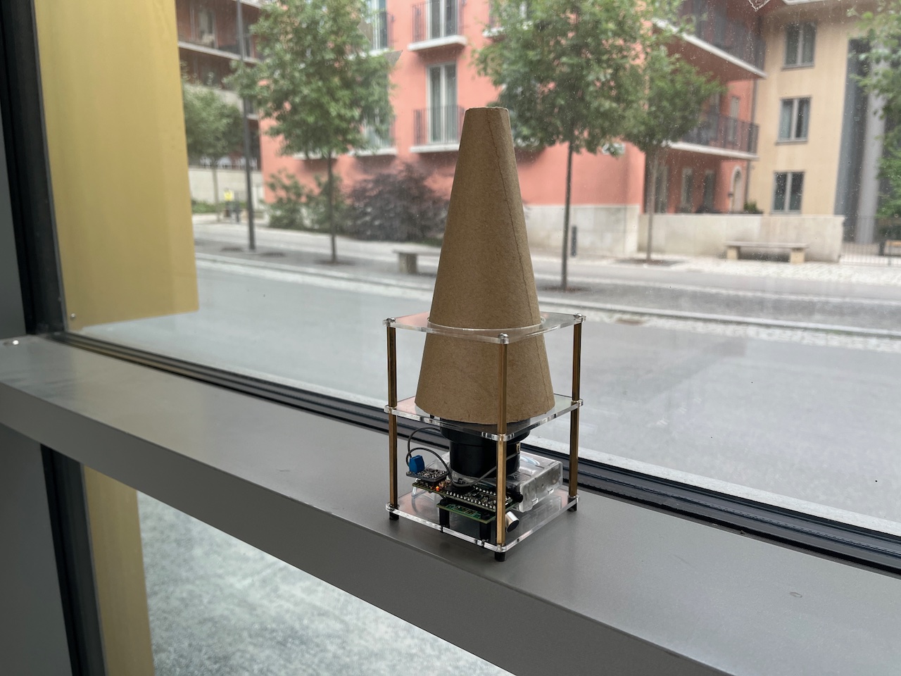 Conic Variations is a sound installation in which cardboard conic sections are used as chambers to impart strong resonances on sounds produced by feedback circuits in each tube. Each circuit delays sounds that derive from a combination of sounds present in the environment. These sounds include the people and ambient sounds of the space, the sounds produced by the other circuits, and the resonated sounds of the tube itself. The resultant sounds are forever evolving in variations derived from interlacing interactions of prior sounds. In this installation the physical materials of the work are highlighted by the specific resonant sounds produced.