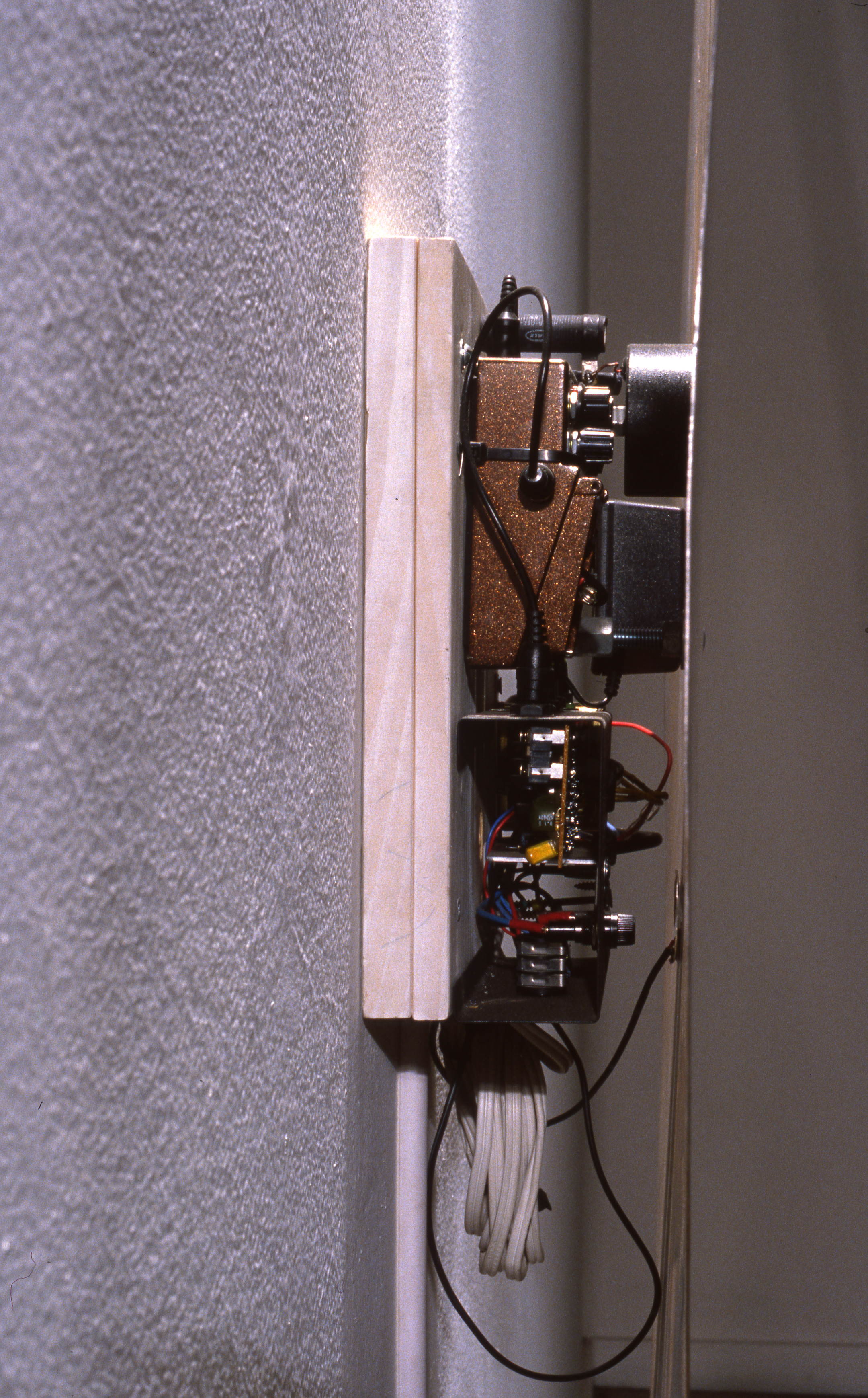 A steel disk is mounted on a wall and excited by a hand-wound electromagnet positioned behind it. A piezoelectric microphone picks up the vibrations of the disk and feeds the signal back to the electromagnet, creating a continuously evolving feedback loop. The disk produces sound through its own resonance.
